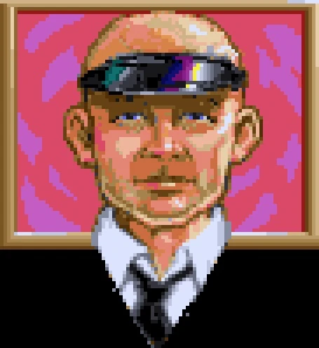 A poster of Crodfoller wearing a red sun visor and with a pair of scales appears is found in a room in The Island of Dr. Brain.